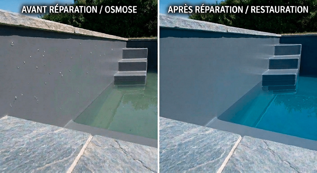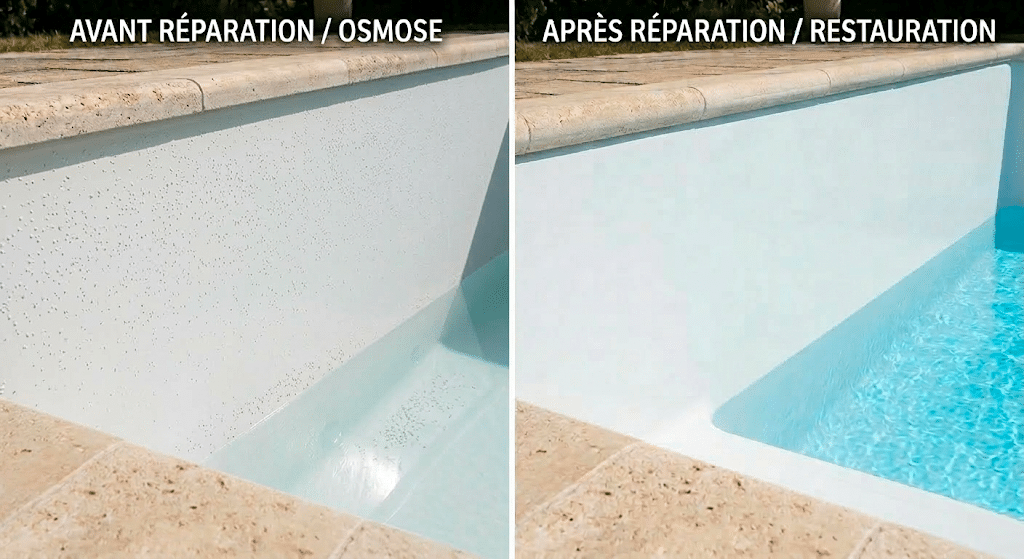 | Réparations / renfort | Réparation fissures, reconstruction zones osmosées, stratification résine + fibre si nécessaire | Stabilité et durabilité, pas de récidive rapide |